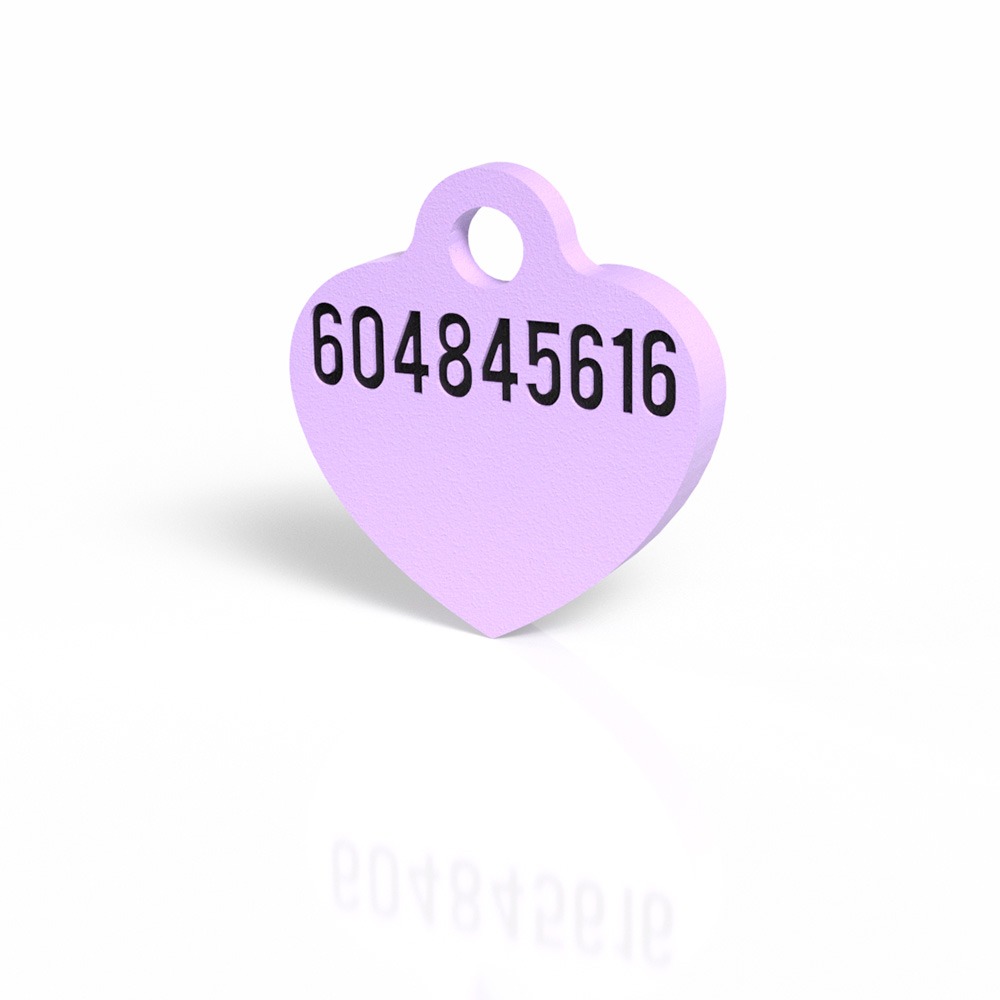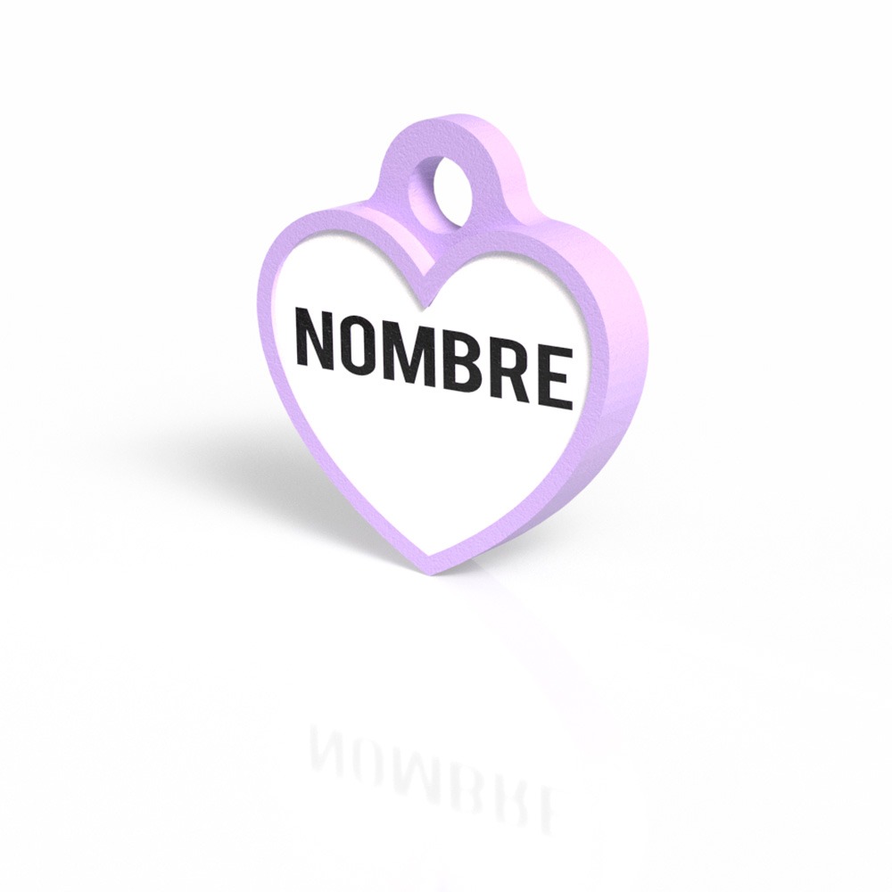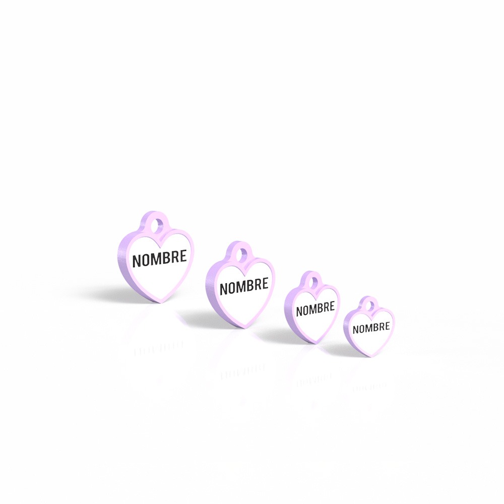 Chapita identificativa en forma de corazón color lila para perros, personalizable con el nombre y número de contacto. Disponible en cuatro tamaños: mini, pequeña, estándar y grande.