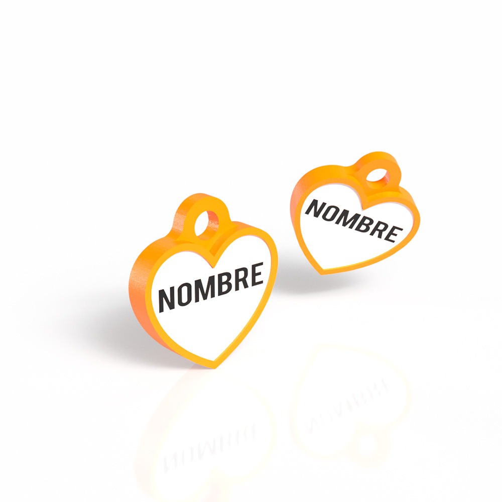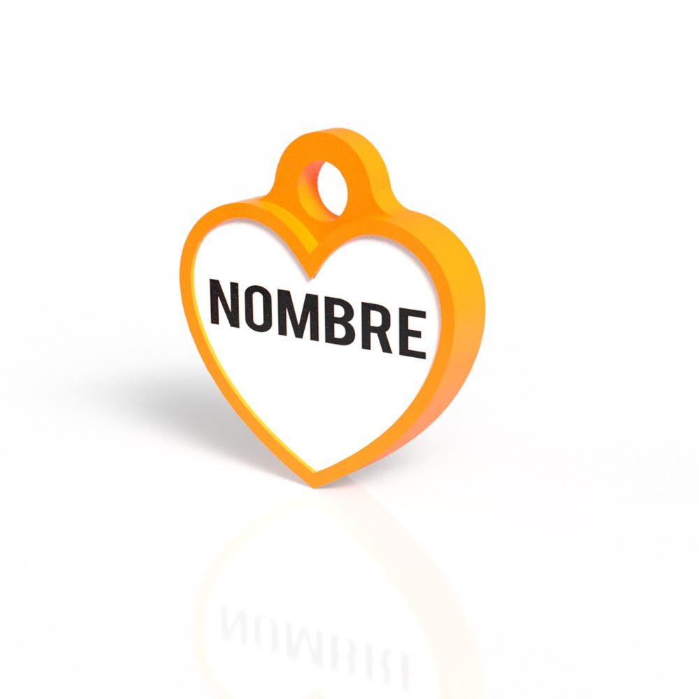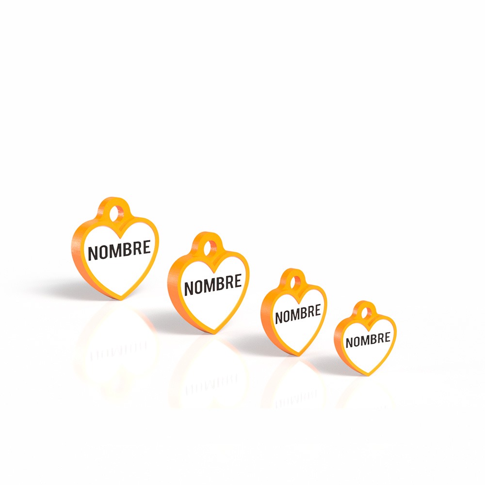 Chapita Corazón Naranja de MiraQueGuau! Personalizable con grabado.  Disponible en cuatro tamaños.