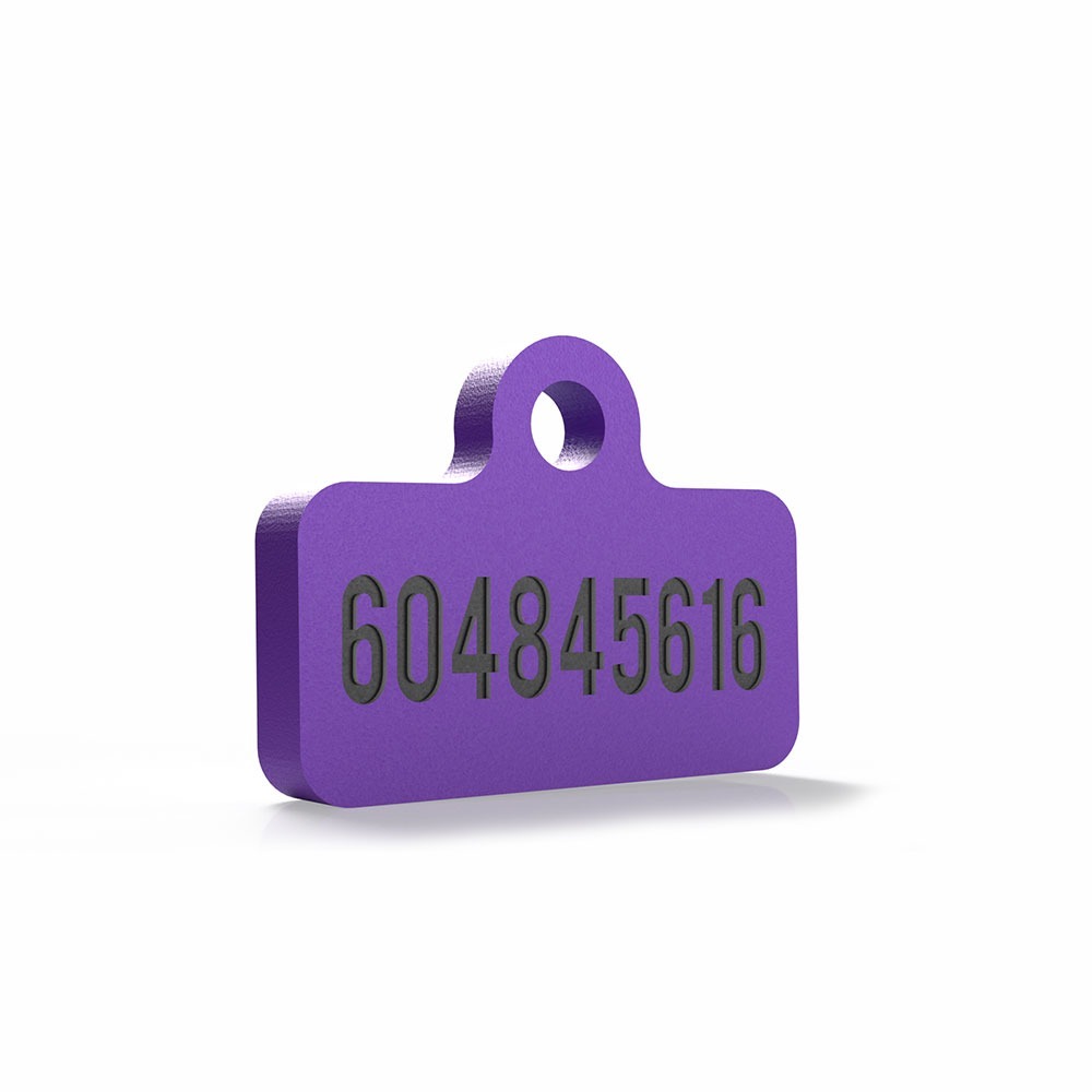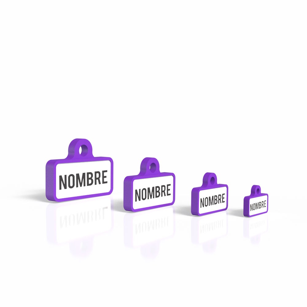 Chapa identificativa retro en color morado para perros, personalizable con nombre y número de contacto. Un accesorio único con un diseño moderno y funcional.